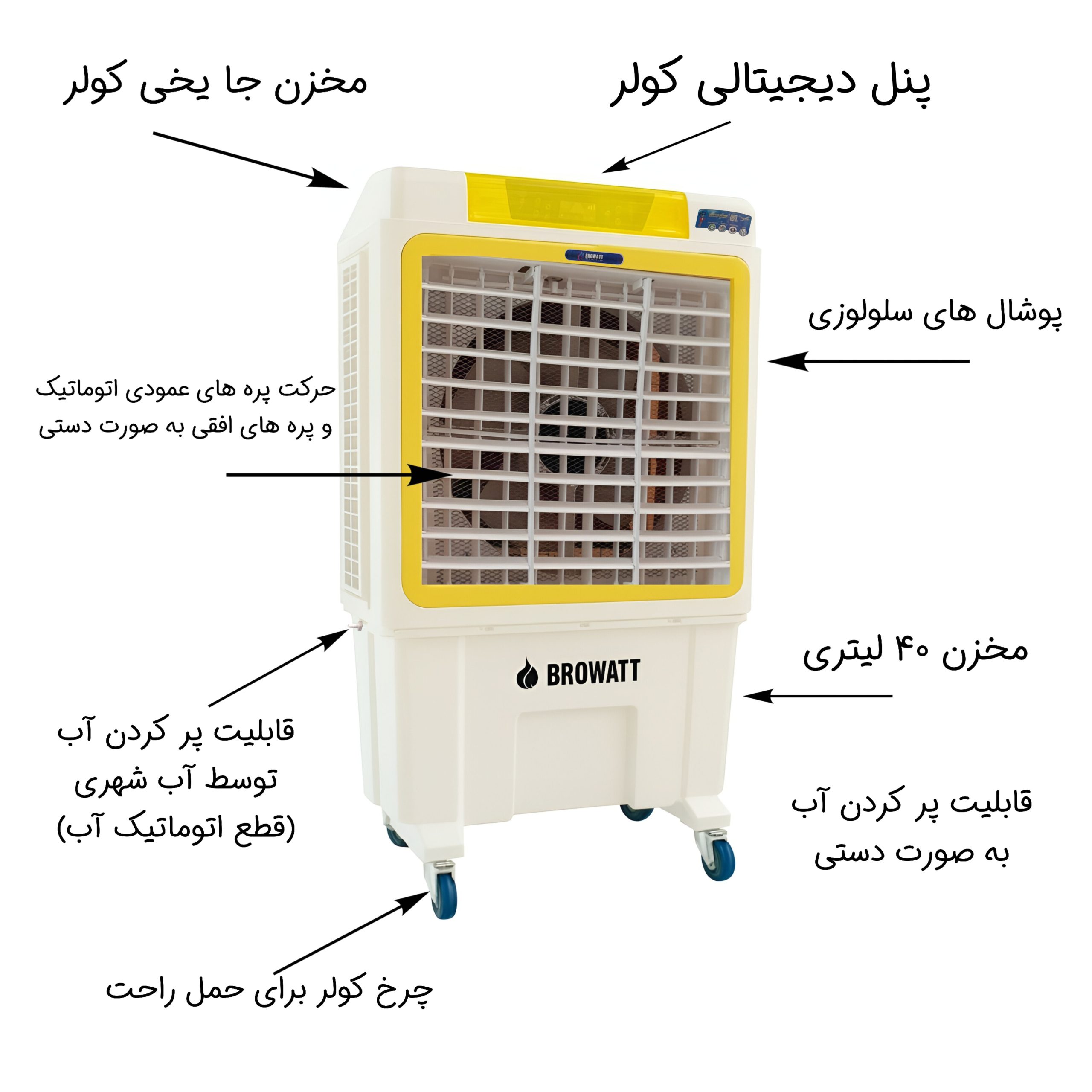 امروزه با گرم تر شدن هوا که هر ساله دمای هوا نسبت به سال های قبل به دلایل مختلفی افزایش می یابد، نیاز به استفاده برای کولر برای انسان ها یکی از واجبات در طول سالیان سال بوده است. کولر های گازی به دلیل گران بودن نسبت به کولرهای آبی خواهان کمتری دارند. البته نوع کولر های آبی نسبت به کولر های گازی خیلی زیاد تر است. کولرهای آبی پرتابل که با نام اختصاری پرتابل بیشتر شناخته می شوند سهم بیشتری از بازار هدف نه تنها در ایران بلکه دنیا را فرا گرفته اند. کولر پرتابل سلولوزی سایز متوسط بروات مدل P-BR 28000 یکی از محصولات جدید سرمایشی شرکت بروات است که نه تنها در ایران بلکه در کشورهای حوزه خلیج فارس نیز به دلیل کیفیت ساخت در بدنه و سلولوز موجود در آن ها پر فروش هستند. این کولر با طراحی خاص و منحصر بفرد خود با توربین بزرگ و قدرت پرتاب بالا نیازهای یک متراژ 50 تا 70 متری را جواب می دهد. این کولر مجهز به نمایشگر دیجیتال و کنترل از راه دور دارد است که این امکان را به شما میدهد تا سرعت باد، نوع باد، فعال کردن پره های عمودی، … را کنترل کنید. این کولر از مخزن 40 لیتری خود بهره می برد به طوری که هوشمند بوده و جریان آب را کنترل می کند. شما به صورت دستی نیز می توانید مخزن 40 لیتری را پر کنید. هوادهی 1500 متر مکعب در ساعت این کولر خود را از بقیه رقبا جدا کرده و بهترین هوادهی و بازخود را به شما می دهد. در بالای این کولر محفظه جا یخی وجود دارد که 2 عدد جا یخی در بالای کولر قرار میگیرد. کاربرد این جا یخی به این صورت است که اگر خواستید برودت کولر را بیشتر کنید باید این جا یخی ها را پر از آب کرده و در یخچال فریزر گذاشته تا یخ بزند. بعد از یخ زدن در بالای کولر بگذارید. موقعی که آب از مخزن به سمت بالا بیاید، آب از روی جا یخی ها رد شده و برودت هوا را بیشتر خواهد کرد. این محصول موقع کار کم صدا بوده و لغزشی ایجاد نمی کند. 4 چرخ زیر کولر نیز این امکان را به شما می دهد تا به راحتی این کولر را حمل کنید. پنل تنظمات و کنترل از راه کولر از دیگر ویژگی های این کولر پرتابل است. در ضمن برای جلوگیری از ضربه یا دست نزدن کودکان به تنظیمات کولر یک کاور باز بست شو نیز جلوی پنل قرار گرفته است. ویژگی بارز این محصول کیفیت بالای این کولر است که جایگزین توجیه پذیری نسبت به کولر های آبی فلزی و کولر های گازی دارد.