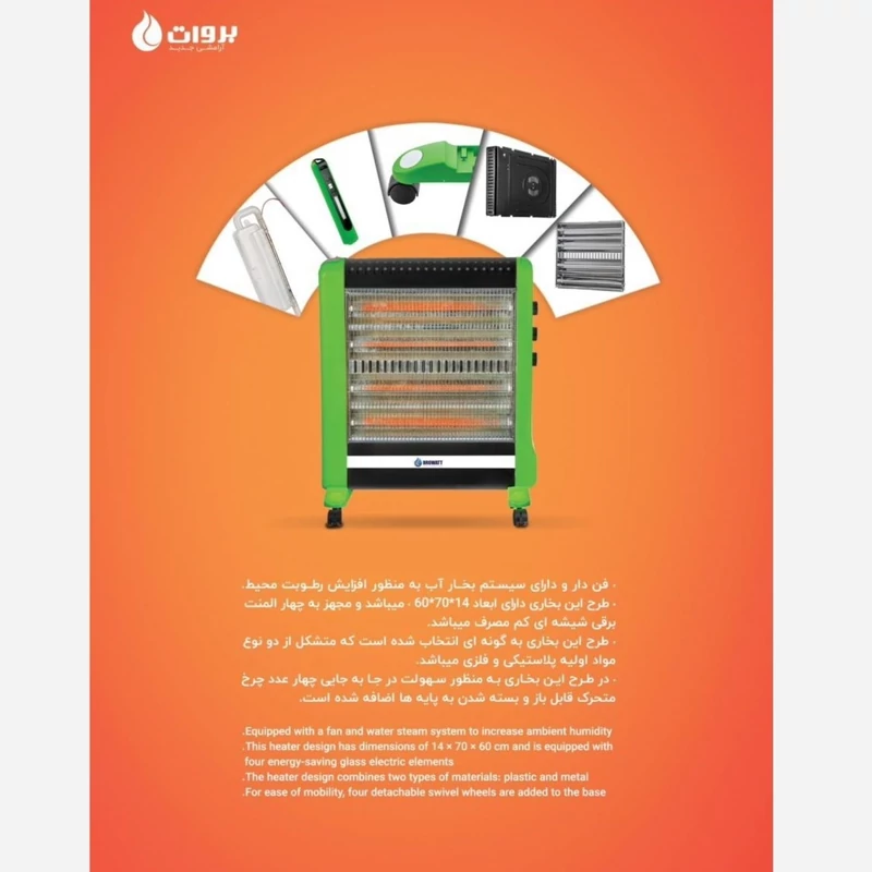 فصل سرما در راه است و باید برای گرم کردن خانه خود چارهای اندیشید. بخاری برقی بروات یک انتخاب عالی برای گرم کردن خانه شما در فصل سرما است. این بخاری با ویژگیهای منحصر به فرد خود، گرمای دلچسب و هوای تازه را به خانه شما میآورد. از ویژگی های این محصول میتوان به فن دار بودن، مخزن بخور، سنسور واژگونی، ترموستات و چرخ دار بودن برای حمل راحت اشاره کرد.
